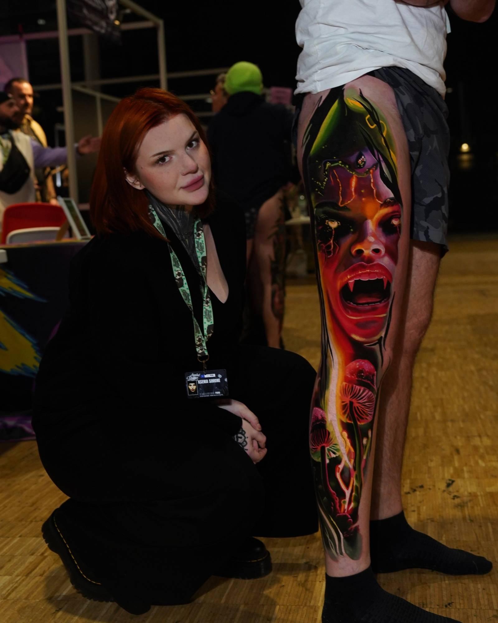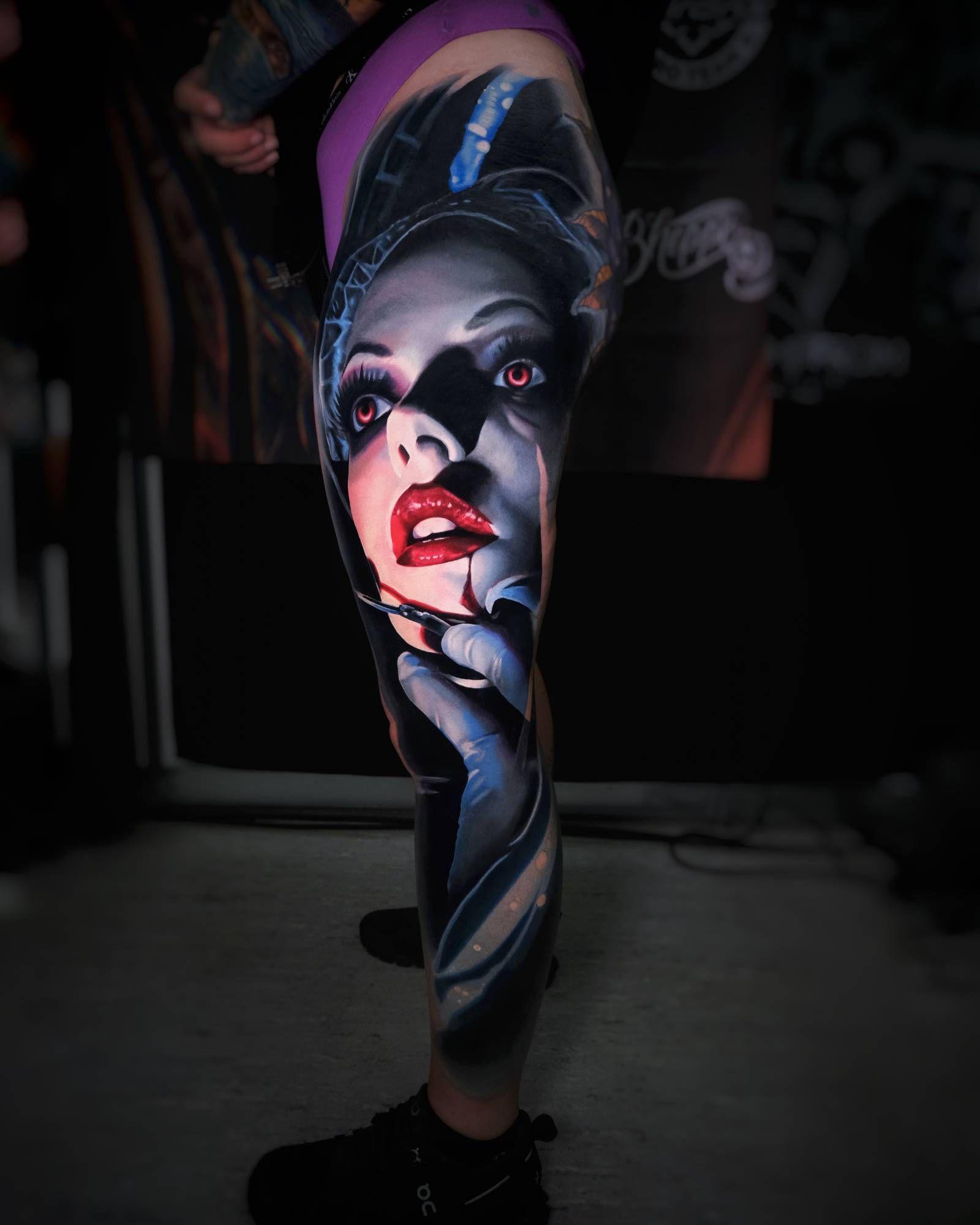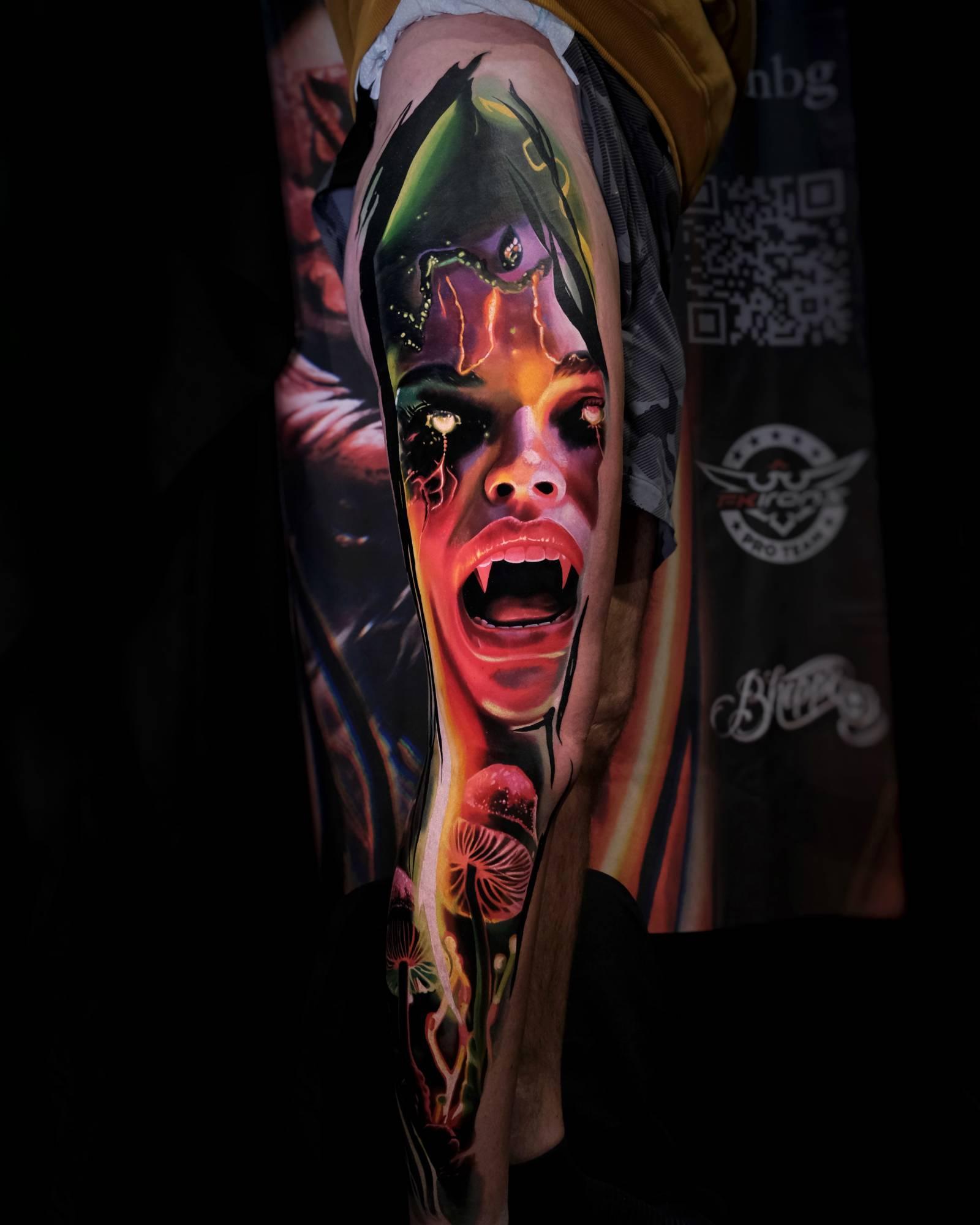Kseniya sensed the power of tattooing before ever picking up a machine. Self-taught and driven, she built her career through discipline and constant evolution. Her work bridges realism and surrealism — in colour with neon atmospheres, in black and grey with contrast and presence, creating portraits, characters, animals and dreamlike scenes where she finds emotional impact. She keeps growing by exchanging knowledge with peers, studying painting and joining conventions and masterclasses.