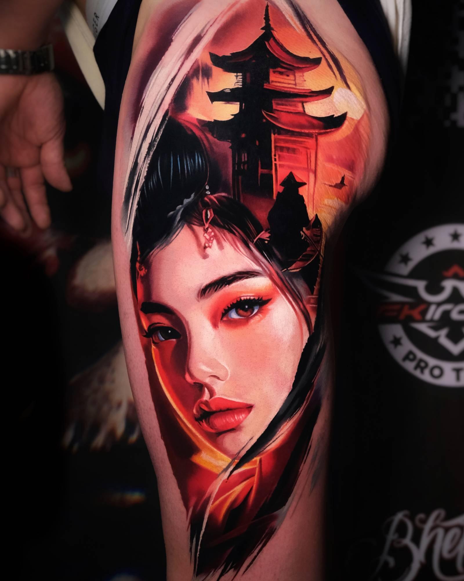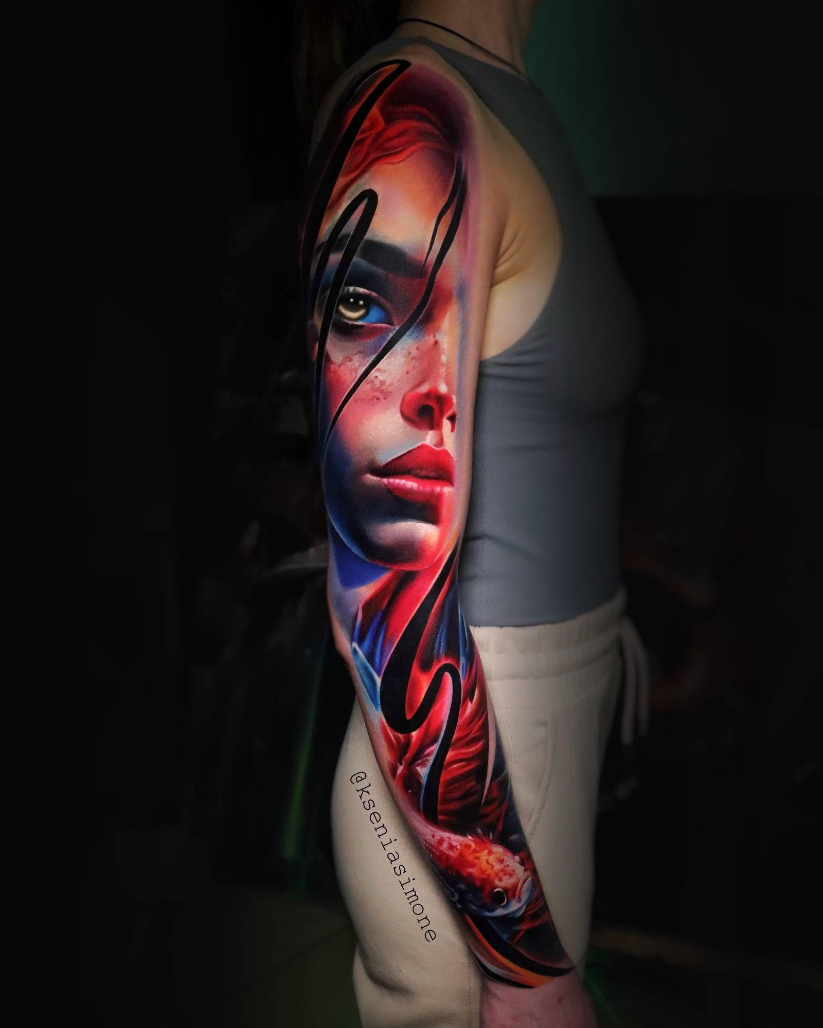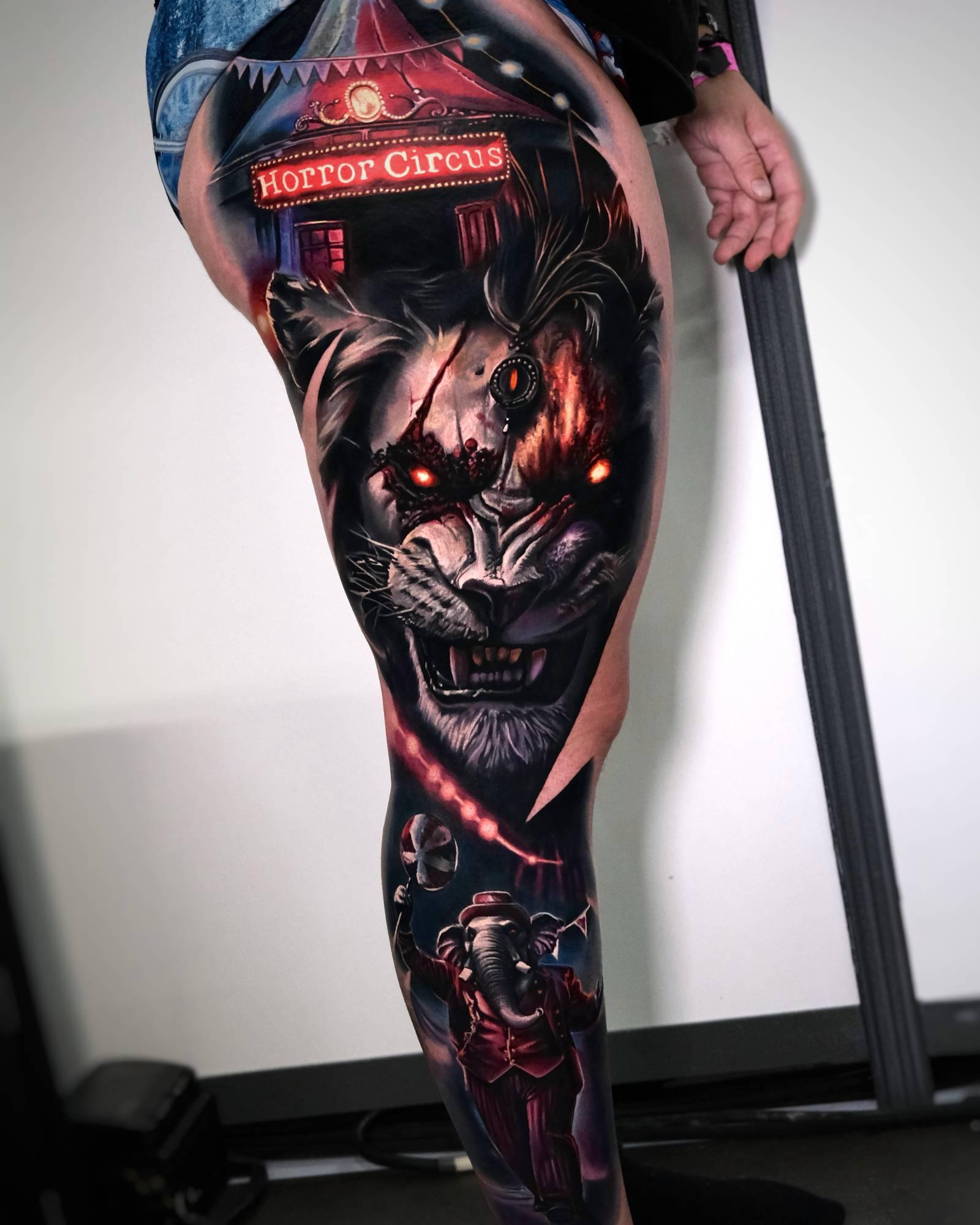 Kseniya sensed the power of tattooing before ever picking up a machine. Self-taught and driven, she built her career through discipline and constant evolution. Her work bridges realism and surrealism — in colour with neon atmospheres, in black and grey with contrast and presence, creating portraits, characters, animals and dreamlike scenes where she finds emotional impact. She keeps growing by exchanging knowledge with peers, studying painting and joining conventions and masterclasses.